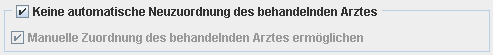 Die Option „Keine automatische Neuzuordnung des behandelnden Arztes“ bestimmt, ob beim Speichern des Patienten der behandelnde Arzt auf den aktuell ausgewählten Arzt gesetzt wird, wenn für den Patienten eine neue Konsultation erstellt wurde.