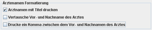 Die Schreibweise des Arztnamens in Ausdrucken wie Verschreibungen, Rechnungen, Mahnungen usw. kann hier variiert werden. Zur Verfügung stehen die folgenden Optionen, die keiner weiteren Erläuterung bedürfen: