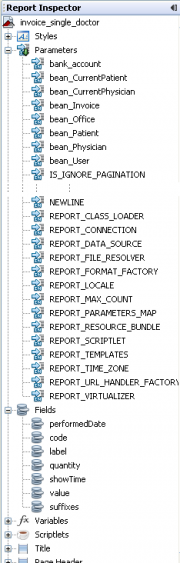 Beim Bearbeiten einer Vorlage können verschiedene Variablen benutzt werden, die beim Drucken durch den entsprechenden Text ersetzt werden. In Abbildung 4 ist ein Beispiel für einige solcher Variablen gegeben. Dabei geben alle unter „Parameters“ stehenden Variablen innerhalb eines Reports immer das gleiche Ergebnis zurück. Sie können überall im Report verwendet werden. Die unter „Fields“ stehenden Variablen hingegen können nur im Detailbereich eines Reports verwendet werden. Diese Werte stehen in einer Liste, über die im Detail Bereich iteriert wird. So werden beispielsweise innerhalb einer Rechnung die Einträge für die Tarife erzeugt.