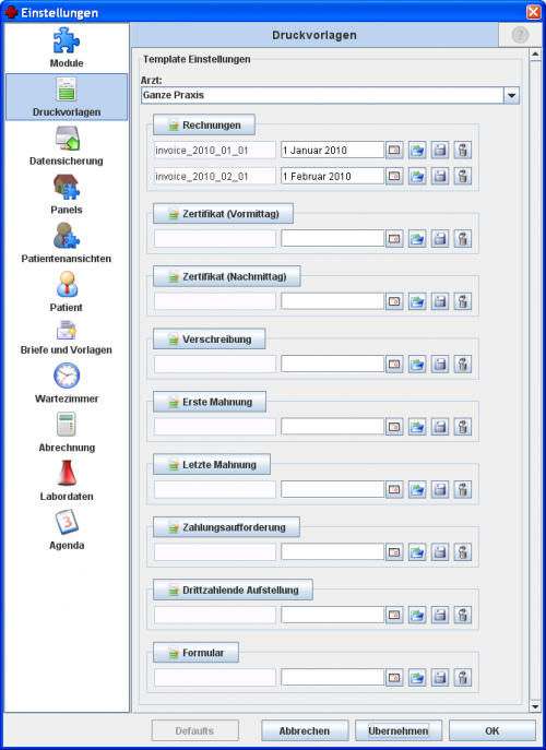 Man kann die mitgelieferte Standardversion jederzeit als *.jrxml Datei exportieren. Diese kann dann mit dem Programm „Jasper iReport“ modifiziert und erneut hochgeladen werden. Die Standardversion wird dabei nicht überschrieben und bleibt also immer erhalten. So können mehrere Versionen eines jeden Vorlagentyps hochgeladen und gespeichert werden. Insbesondere kann sowohl jeder im System eingetragene Arzt als auch die ganze Praxis eine eigene Version eines bestimmten Vorlagentyps haben. Zusätzlich kann jede dieser Versionen nochmal mehrfach vorhanden sein, wobei ein Ablaufdatum zur Auswahl der aktuellen Variante benötigt wird. Wir sprechen im Folgenden von Datums-Varianten.