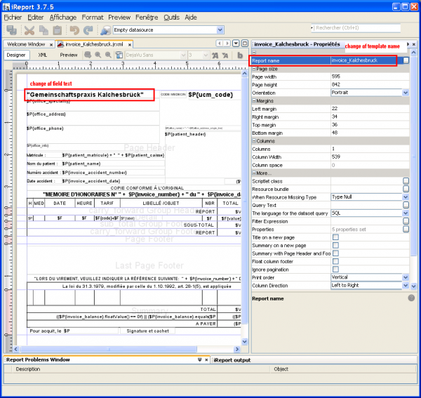 Diese Datei kann dann mit dem oben erwähnten iReport Programm angepasst werden (siehe rot eigerahmte Felder). Als Beispiel wird hier ein konstanter Text für den Namen der Praxis anstelle der Liste aller Ärzte eingetragen. Dazu gibt es zwei Möglichkeiten. Man kann das bestehende Textfeld benutzen, wobei man auf die Anführungszeichen um den Text achten sollte („Gemeinschaftspraxis Kalchesbrück“). Die bessere Variante wäre jedoch das aktuelle Textfeld zu löschen und an dieser Stelle ein Label (Static Text) einfügen. Außerdem sollte man noch den Namen der Vorlage selber in der Eigenschaftsliste des Reports ändern, was später die Unterscheidung der verschiedenen Versionen im Vorlagen-Dialogfenster vereinfacht. Es wird nämlich nicht der Name der Datei angezeigt, sondern der interne Name der Vorlage (Report name property).