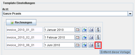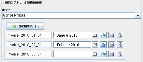 Dazu klickt man auf die Schaltfläche, die dem Typ der Vorlage entspricht, für die man Datums-Varianten einführen möchte. Es erscheint sodann eine neue leere Zeile, in die die Datums-Variante hochgeladen werden kann. Im Datums-Feld der alten Variante gibt man dann das gewünschte Ablaufdatum an. Im obigen Beispiel würde z.B. die erste Vorlage (invoice_2010_01_01) einschliesslich bis zum 1.1.2010, die zweite (invoice_2010_02_01) bis einschliesslich zum 1.2.2010 und die dritte (invoice_2010_06_01) ab dem 2.2.2010 verwendet.