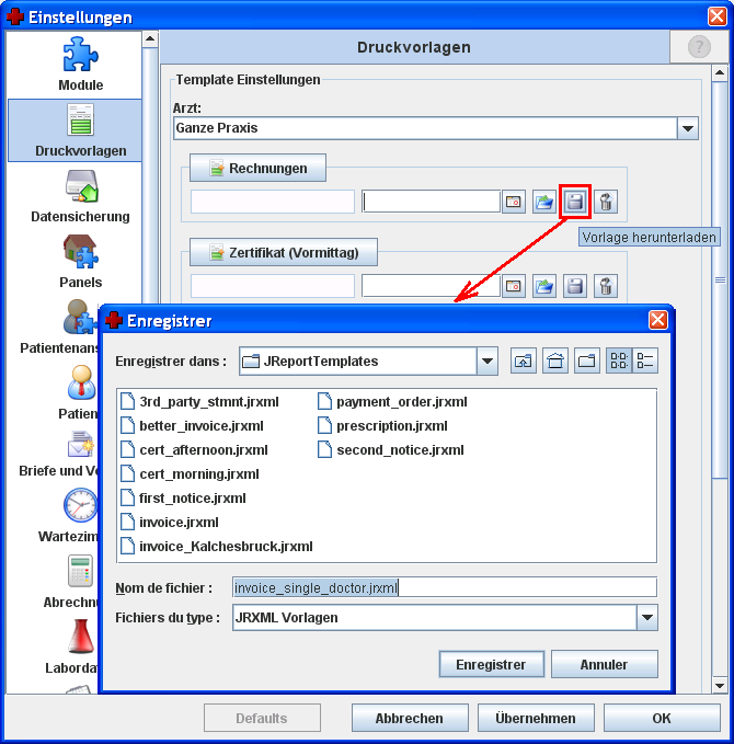 Zum Herunterladen einer Druckvorlage benutzt man die Funktion „Vorlage herunterladen“. Dabei wählt man einen Ort zum Abspeichern im Dateisystem des Computers aus. Ein Name für die abzuspeichernde Datei im jrxml(=Jasper Report)-Format wird vorgeschlagen. Der Name kann nach Belieben verändert werden, wobei die Endung „.jrxml“ aber erhalten bleiben muss.
