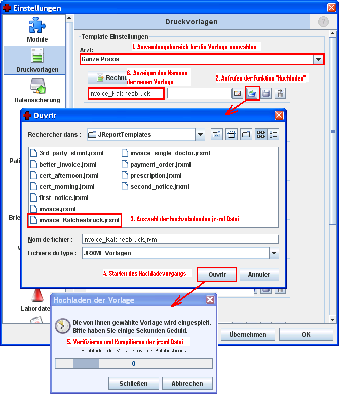 Die so angepasste Vorlage kann nun mithilfe der „Hochladen“ Funktion als neue Version eingelesen werden. Entsprechend der jeweiligen Auswahl des „Arzt“ Feldes wird die neue Vorlage nur für einen bestimmten Arzt oder aber für die ganze Praxis verwendet, d.h. unabhängig vom aktuell ausgewählten Arzt. Die Vorgehensweise ist wie folgt: