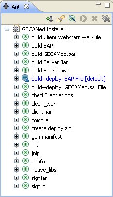 icon in the Ant view. Open your project folder in the opening dialog and double click the “build_sources.xml” file in the “installer” folder. A new build file was added to your Ant view, called “GECAMed Installer”. Expand it and you will see the different tasks that can be done with this build file. The task needed to deploy the server EAR is called “build+deploy EAR File”.