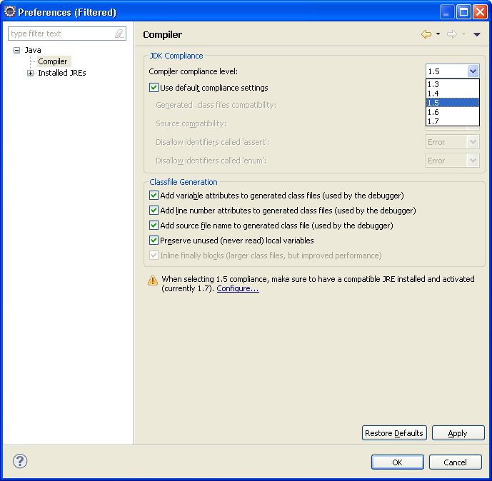 To change the compiler compatibility you need to click on “Configure JREs…” under the point “JRE”. The “Preferences”-dialog will open. Choose “Compiler” on the left tree and set the “Compiler compliance level” to 1.5 and confirm the changes with “OK”.