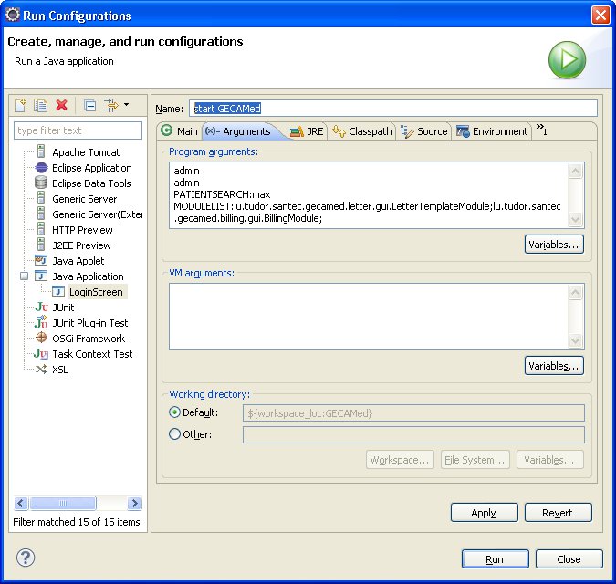 You can configure the arguments in Eclipse in the Run Configurations (“Run” - “Run Configurations …”). Select the Java application you want to configure on the left side. The GECAMed you started will be called “LoginScreen”. On the right side you can give it another name, like “start GECAMed”. In the tab “Arguments” you can specify the arguments given. The following things can be configured with the arguments: