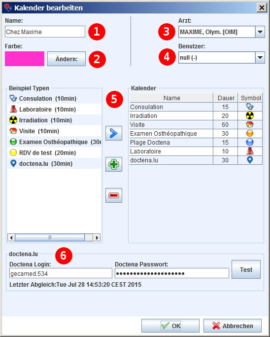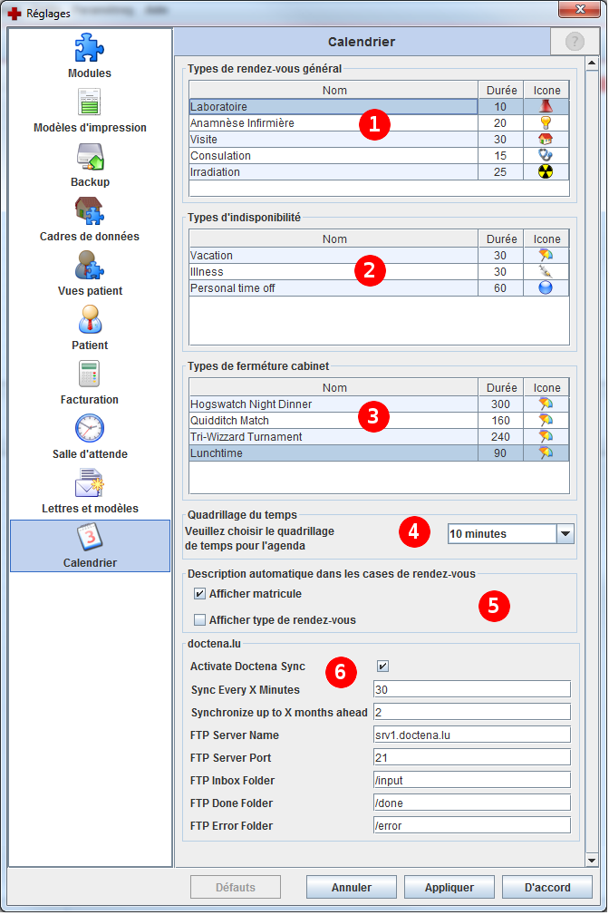 Les types généraux - de rendez-vous, d'indisponibilité - de cabinet fermé - peuvent être créés, modifiés et supprimés. Vous pouvez librement leur choisir un nom, une durée (en minutes), et un symbole. Ainsi, il est possible de créer des types adaptées à tous les besoins et être ajouter ensuite dans les calendriers.