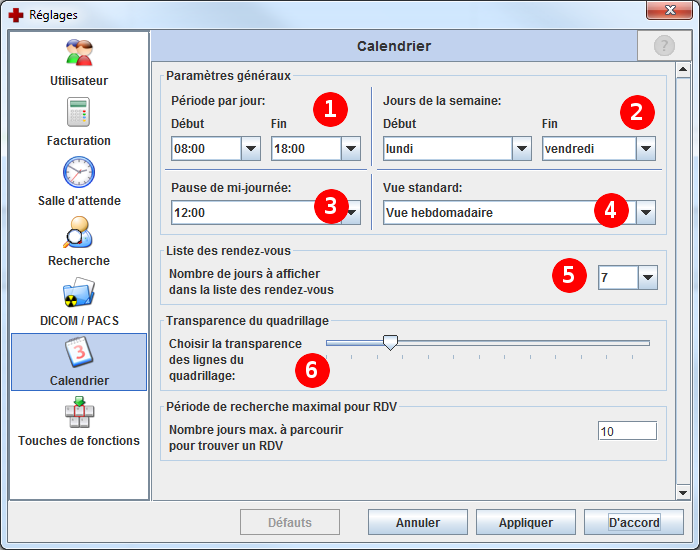 | Période journalière à afficher. Cela permet de limiter l'affichage au horaires de travail de l'utilisateur au cabinet et ainsi masquer les heures inutilisées. | |
