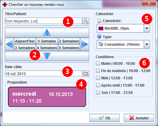 Si vous choisissez de cliquer sur le bouton “Suggérer nouveau RDV”, une nouvelle fenêtre s'ouvre pour rechercher un créneau libre pour un nouveau rendez-vous (figure 6). Cette fonction peut être également lancée à partir du module patient pour rechercher un nouveau rendez-vous pour le patietn en cours. Différents critères vous permettent de rechercher un créneau libre pour un nouveau rendez-vous.