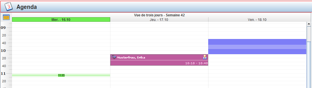 Le vue de trois jours montre la journée en cours et les deux suivantes. C'est pratique si vous souhaitez une bonne représentation des rendez-vous du jour courant et de garder une vue sur les jours suivants.