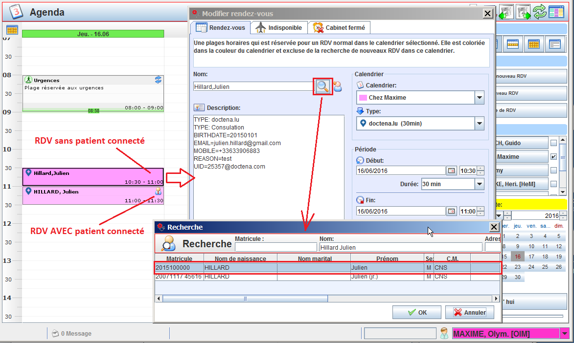 En plus du nom de patient, les données de RDV transmises par docténa (date de naissance, email, n° tél.) sont repris dans le RDV GECAMed. Ces informations peuvent servir à associer le RDV à un patient existant dans GECAMed, voir d'en créer un nouveau.