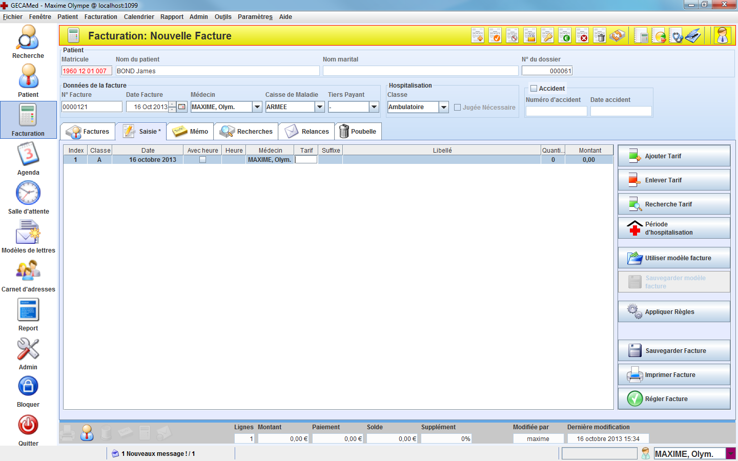 Une nouvelle ligne apparaît sur la facture. Lorsque vous ajoutez un nouveau tarif, la date de la prestation tarifée est considérée comme la date de la facture. La date du tarif peut également être modifiée individuellement pour chaque prestation. Comme pour les autres modules, la couleur de fond de la barre de titre change en jaune, ce qui signifie que les données ont été modifiées et la facture doit être enregistrée. Lors du nouvel ajout, la colonne «tarif» est déjà sélectionné et attend la saisie du code tarif de la CNS que vous voulez ajouter.