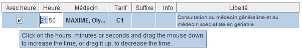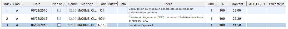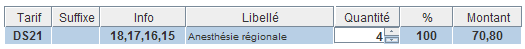 Les tarifs peuvent être multipliés. Un bon exemple est le tarif kilométrique pour une visite à domicile, ou bien de l'anesthésie locale pour dents. Pour spécifier la quantité d'un tarif, il faut cliquer sur la colonne Quantité et soit entrer le numéro directement, soit utiliser les deux petites flèches.