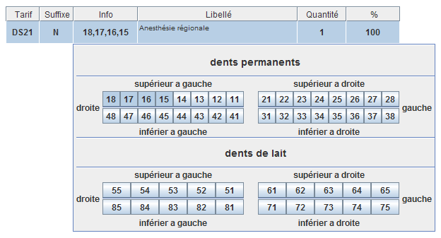 Les tarifs commençant avec un “D” (Dental) sont équipés avec un outil de sélection de schéma dental FDI, à deux chiffres. On peut choisir plusieurs dents en même temps.