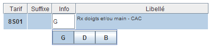Pour tous les tarifs techniques du groupe d'imagerie radiologique (commençant avec un “8”) une boite de sélection pour déterminer la latéralité de l'acte est proposée : G - “gauche”, D - “droite”, B - “bilatéral”