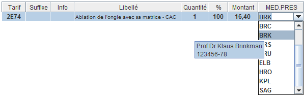 Pour cela faire, il faut enregistrer les médecins correspondants dans le carnet d'adresses de GECAMed, y compris leur code CNS et un raccourci. Tous les médecins du carnet d'adresse avec ces informations sont disponibles en tant que raccourci dans un menu déroulant lors de la saisie du MED.PRES. Bien entendu, sur la facture apparait le code CNS du médecin, non pas son raccourci.