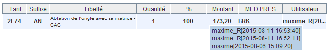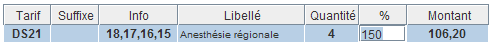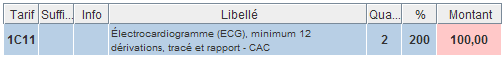 Dès que le code d'un tarif est choisie la colonne “Montant” affiche le montant de la prestation. Des modificateurs comme les suffixes, la quantité et % impactent le montant du tarif immédiatement, dès qu'il a été confirmé par la touche TAB. De plus, il est possible de saisir un montant complètement manuellement, tout en gardant les modificateurs. Ça se fait en cliquant dans la colonne du montant et en saisissant une valeur avec le clavier. Celle-ci remplace le montant original et ne sera pas non plus influencée par les modificateurs. La situation particulier du montant saisie manuellement est exprimée par le coloriage rouge des champs de montant concernés.