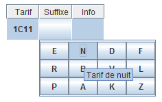 Les règles de facturation du Luxembourg prévoient que le code du tarif peut être complété par un ou plusieurs suffixes. Par exemple, le tarif de nuit d'un service est complété par le suffixe «N». Si un service survient un week-end ou un jour férié, le tarif est renforcée avec le suffixe «F». Pour changer le suffixe, cliquez sur la colonne Suffixe. Il apparaît une boîte avec l'ensemble des suffixes disponibles.