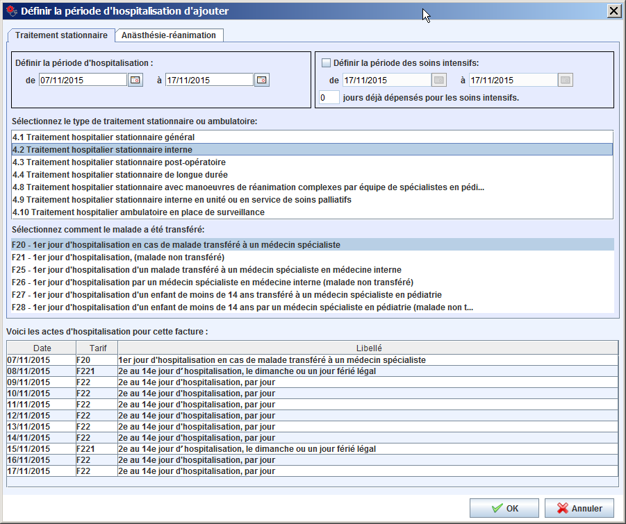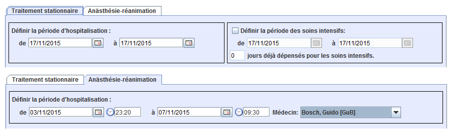 Le fonctionnement est le suivant: on détermine d'abord le mode principal de fonctionnement en choisisant l'un des deux onglets, “Traitement stationnaire” ou “Anesthésie-réanimation”. Par la suite en renseigne les dates de début et de fin de séjour hospitalier. Pour le traitement stationnaire on peut optionellement préciser une période de soins intensifs, tandis que dans l'onglet Anesthésie-réanimation on devrait plutôt préciser l'heure d'arrivé et de départ, ainsi que le médecin de prise en charge.