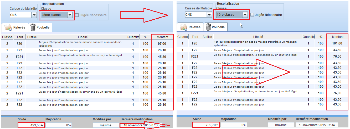 Immédiatement tous les tarifs sur la facture sont augmetés de 66%. La CNS par contre ne rembourse une facture que sur base des 100% correspondant à la classe 2. Les 66% de supplément doivent être pris en charge par le patient lui-même, ou une assurance complémentaire.