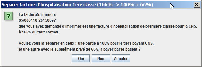 Le dialogue de confirmation pour la séparation d'une facture 1ère classe CNS apparait avant l'impression. Trois choix sont possibles :