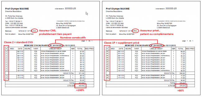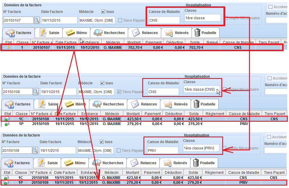 La facture originale (de classe 1) est supprimée et mis dans la poubelle des factures, d'où elle peut être restaurée en cas de besoin. La classe 1C sur la facture CNS à 100% correspond à une classe 2 normale est imprimée comme classe 2 pour la CNS. La classe 1P sur la facture privé à 66% est imprimée comme classe 1P pour l'assurerur PRIV.
