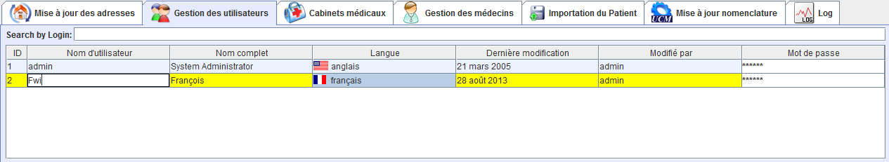 Ouvrez l'onglet nommé “Gestion des utilisateurs”. Il vous permet de créer, modifier et supprimer des utilisateurs. Créer pour chaque personne du cabinet un utilisateur distinct et un mot de passe. Pour ce faire, aller dans la section «Liste des utilisateurs» (figure 1) et cliquer sur “Ajouter un utilisateur”. Alors, une nouvelle ligne apparaît dans le tableau. Cliquez dans chaque cellule de la nouvelle ligne et saisissez les données de l'utilisateur. Ensuite, appuyez sur “Enregistrer l'utilisateur” pour terminer l'opération. Répétez cette opération pour tous les utilisateurs que vous souhaitez créer.