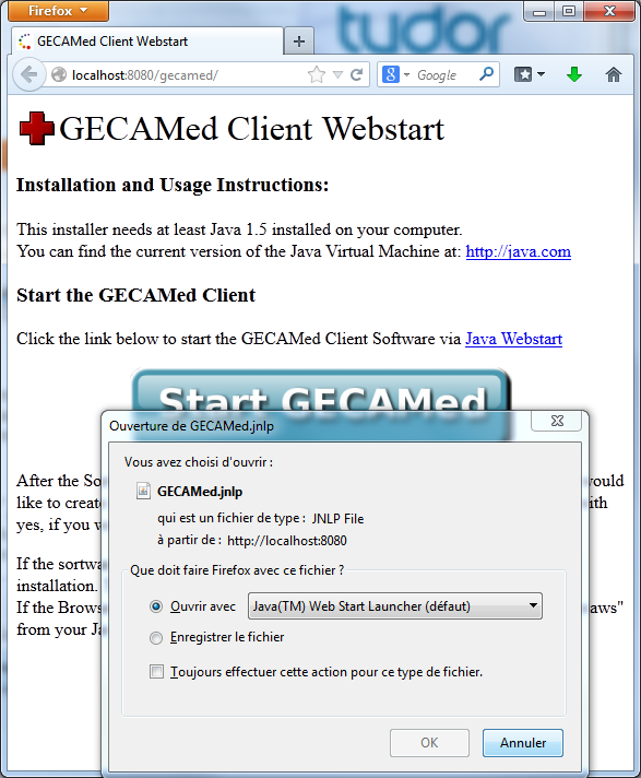 Veuillez ouvrir le navigateur et saisir l'adresse http://localhost:8080/gecamed dans la barre de navigation pour atteindre la page d’accueil du GECAMed. Puis, cliquez sur le bouton “Start GECAMed”. Le navigateur va tenter de télécharger le client GECAMed sur votre ordinateur local et une fenêtre s'ouvre pour vous demander ce qu'il doit faire avec ce fichier. Choisissez à cette étape “ouvrir avec Java” (voir figure 1).