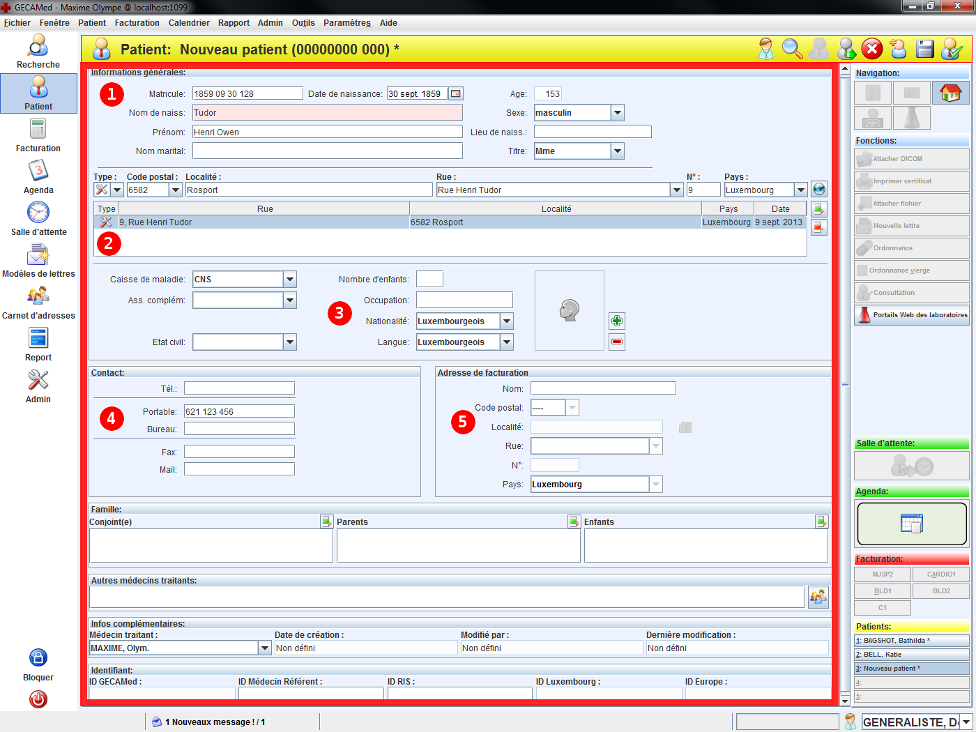 Un nouveau patient vient vous consulter pour la première fois en cabinet. Ouvrir GECAMed et créez un nouveau dossier patient, dans lequel vous saisissez et enregistrez les données administratives du patient.