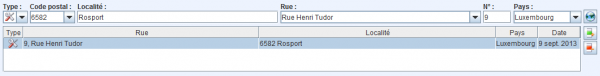 Un patient peut avoir plusieurs adresses. Le champ “Type” indique l'importance de l'adresse. Normalement, une seule adresse de facturation est suffisante (symbolisé par l'euro). Vous pouvez saisir autant d'adresses que le patient souhaite déclarer.