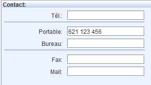 Remplissez les champs de la quatrième section pour renseigner les contacts possible du patient. Ceux-ci se composent des champs numéro de téléphone, de portable, de bureau, de fax et d'une adresse email.