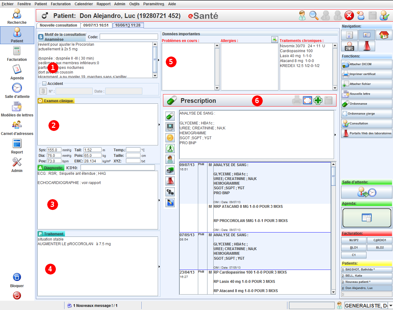 La zone Données importantes (5) est prévue pour saisir toutes les informations importantes des patients qui ont une valeur à long terme comme ses problèmes actifs, ses allergies ou ses traitements chronique en cours. Les données saisies seront également affichées pour les prochaines consultations. Saisissez-y alors dans ces champs, toutes les informations que vous pensez être importantes pour les consultations futures.