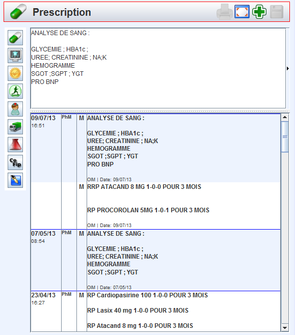 A chaque consultation, vous pouvez créer une ou plusieurs prescriptions pour un patient. Pour faciliter l'interaction de la consultation avec la prescription, l'éditeur de prescription a été intégré dans la vue de consultation. De plus, une prescription peut être créée indépendamment d'une consultation. Les nouvelles prescriptions sont ajoutées à la liste des prescriptions déjà existantes lors de l'enregistrement.