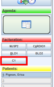 Les modèles de facture sont disponibles dans la barre d'outils de droite, sous la rubrique Facturation. Ils sont représentés par de petits boutons portant le nom du code de facturation présent dans le modèle. Chaque bouton représente un modèle de facture. Lorsque vous appuyez sur un de ces boutons, une nouvelle facture avec le modèle sélectionné sera créée pour le dossier patient actuellement ouvert. Il ouvrira automatiquement le module de facturation dans lequel vous pouvez éditer la facture (voir figure 1).