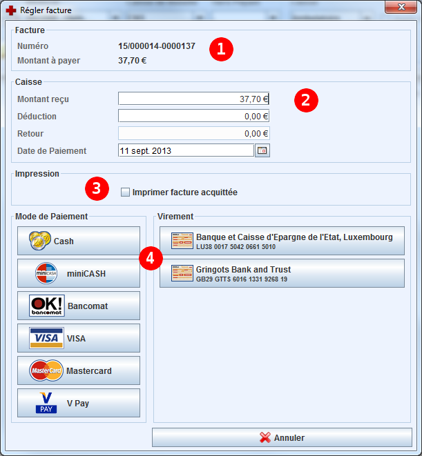 La fenêtre “Régler facture” (figure 2) s'ouvre lorsque vous appuyez sur le bouton Régler Facture.