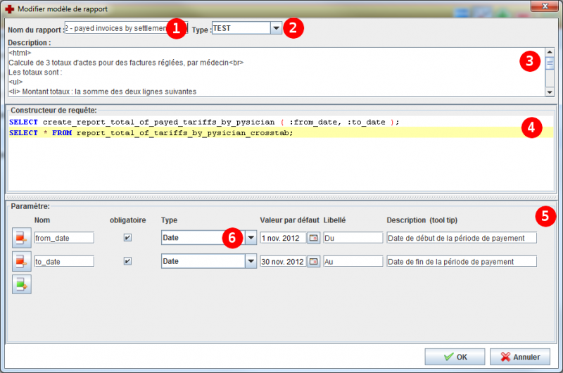 Certains paramètres sont déjà préréglées. Ils peuvent être trouvés dans le tableau reporting.parameter_query de la base de données.