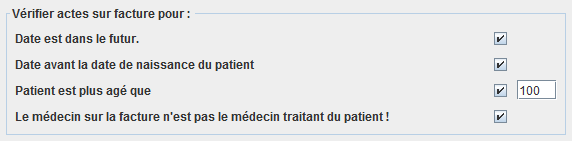 Ce groupe d'options permet d'activer plusieurs tests de plausibilité sur le contenu de la facture. Elles sont exécutés soit lors de la création de la facture, soit pendant l'ajout d'un acte. Si une condition est remplie, un message d'avertissement est affiché, à savoir