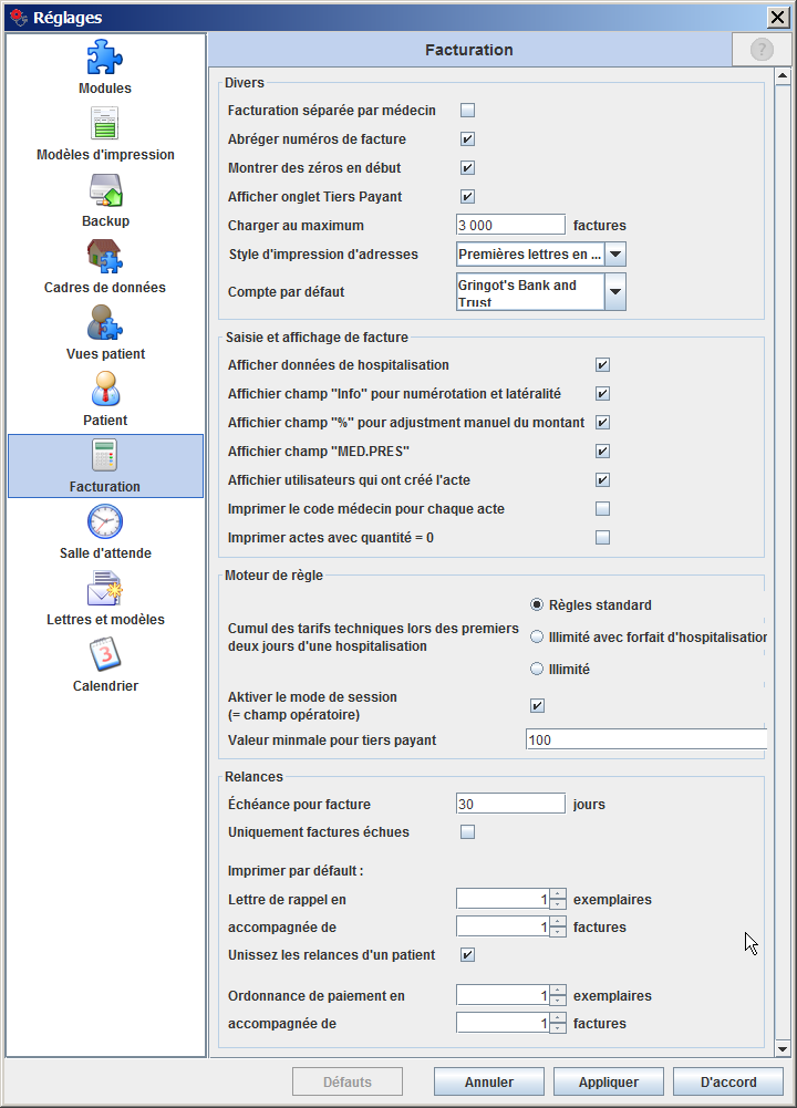 Chaque utilisateur de GECAMed a la possibilité de régler divers paramètres du module de facturation selon ses besoins. Les paramètres de l'utilisateur sont accessible via la barre des menus 'Paramètres'⇒'Paramètres'.