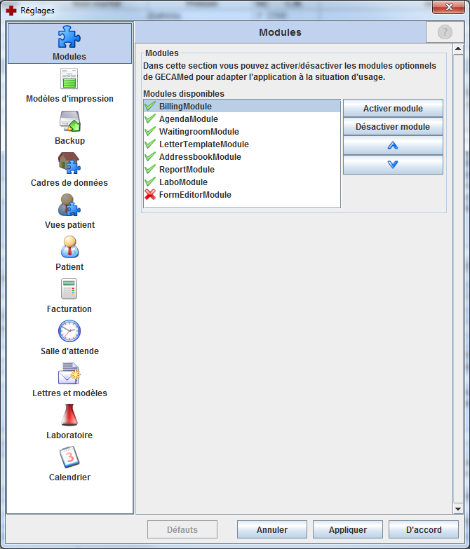 Le groupe de paramètre Module permet de choisir quels modules fonctionnels sont actifs (visibles) et l'ordre d'affichage de ces modules dans la barre de module à gauche. Afin d'optimiser le démarrage de GECAMed, il est conseillé à l'administrateur de désactiver tous les modules inutilisés.