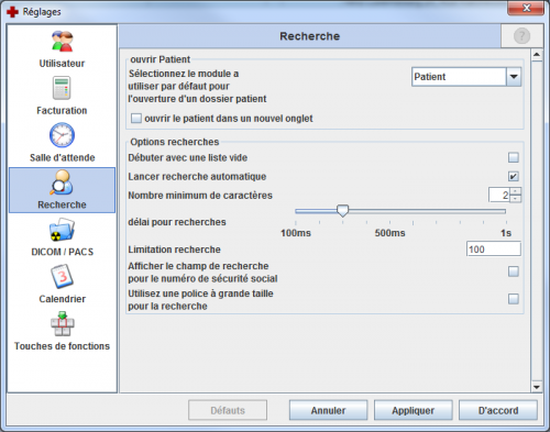 La fenêtre Réglages permet de paramétrer les options suivantes du module de recherche patient: